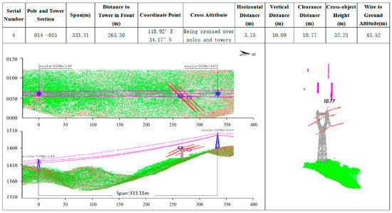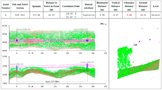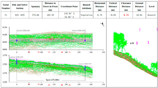 In the management of the hazard detection results of the transmission line, three-view charts are used to display the location coordinates, hazard types, hazard distance, and other information of the hazard points in detail (Figure 21, Figure 22, Figure 23 and Figure 24), which greatly facilitates the follow-up staff s’ investigation and removal of the hazard points, and guarantees the quick and effective supply of power resources.
