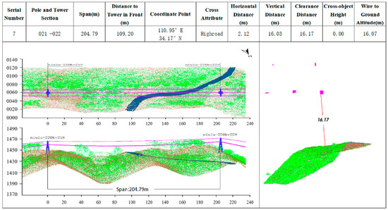 The three views generated by the power corridor point cloud data and the hazard detection results of the transmission lines are used to show the horizontal, vertical, and clearance distances between the transmission lines and ground objects such as vegetation, which are used to determine whether they meet the safety distance, as shown in Figure 21, Figure 22, Figure 23 and Figure 24. Figure 21 illustrates a transmission line crossing over another transmission line, which is considered safe, while Figure 22 depicts a transmission line crossing over a road, also deemed safe. Conversely, point cloud positions that do not meet the provisions are marked as unsafe and colored red, with corresponding information stored. Figure 23 illustrates a transmission line and vegetation clearance distance of 7.43 m and Figure 24 shows a clearance distance of 6.73 m, falling short of the required 7.50 m.