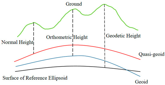 The research work conducted in this paper uses a variety of devices to obtain different data (Table 1 and Table 2). Due to the differences in the elevation system and coordinate system used by different devices in obtaining data, the elevation system and coordinate system need to be unified for multi-device collaborative data acquisition and data processing. The elevation system mainly includes geodetic height, orthometric height, and normal height systems [38], as shown in Figure 25. Different elevation datum planes correspond to different elevation systems, so the elevation values and attributes obtained by using different elevation systems to measure the same ground coordinate point are different. Because the DJI M300 RTK is based on the EGM96 geoid model for variable-height flight, its elevation system adopts the orthometric height system, and the normal height system is used instead of the orthometric height system in practical application. The positioning elevation of the DJI Phantom 4RTK is geodetic height, so it is necessary to convert the positioning elevation of the DJI Phantom 4RTK, so as to carry out 3D laser scanning of the power corridors under the premise of ensuring the safety of the detection equipment.