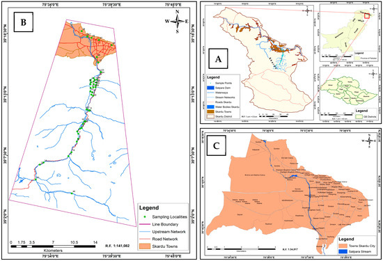 Satpara watershed is located south of Skardu City, Gilgit-Baltistan, Pakistan. It includes various small tributaries and a natural lake. The government of Pakistan upgraded the lake to a dam. It lies between longitude 75°45′24″ E and latitude 35°17′52″ N at an altitude of 8692.7 feet (2649.5 m) and pounds roughly 90,000 acre-feet (110,000,000 m3) of water [31]. Satpara watershed spreads across an estimated area of 2.5 km2. It extends from the Deosai plateau (upstream) to Ranga (downstream), where the stream is drained into the Indus River. Figure 1 provides a map of the channels and tributaries of the watershed. It supplies 3.1 million gallons of potable freshwater and irrigates 15,000 acres (61 km2) of land daily. Satpara Village is located along the Satpara Dam, and most of the inhabitants practice farming and cattle rearing. In the figures given below; Figure 1A is showing Skardu district with provinces of Pakistan and Gilgit-Baltistan districts in the inset, Figure 1B is showing the Satpara Watershed with sampling localities labeled with sample identification numbers 1 to 51 explained in the Appendix A section Table A1, and Figure 1C is showing the town boundaries of the municipal areas and Satapara Watershed, respectively.
