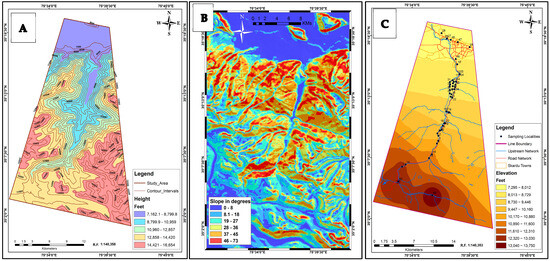 Contour lines are extracted from the 30 m Shuttle Radar Topography Mission (SRTM) and the Digital Elevation Model (DEM) acquired from the United States Geological Survey (USGS), and these are significant for measuring the height of any topography shown in Figure 2A. Contour values are changing consistently due to the uneven topography, having a minimum of 7162.07 feet and a maximum of 16,653.5 feet (Figure 2A) from the Chumik desert new city area to the top of the Deosai plateau, like the elevation map (Figure 2C). The slope of the study area varies from 0 to 8 degrees or 0–1.29% (Figure 2B) along Skardu new city Chumik area and Deosai Shatong Nullah adjacent areas; however, the steepest slopes consist of 46–73 degrees or 12–23.5% along Ulding Broq, Grayul Broq, Chundah Broq, and adjacent slopes near Ali Malik area shown in Figure 2B. Elevation varies from 7295 feet (Chumik village) to 13,750 feet (Shatong Nullah Origin). In the elevation difference map, the light to dark brown color shows the height difference from lowest to highest areas. However, the other two maps show the elevation changes through the viewshed, as shown in Figure 2C.