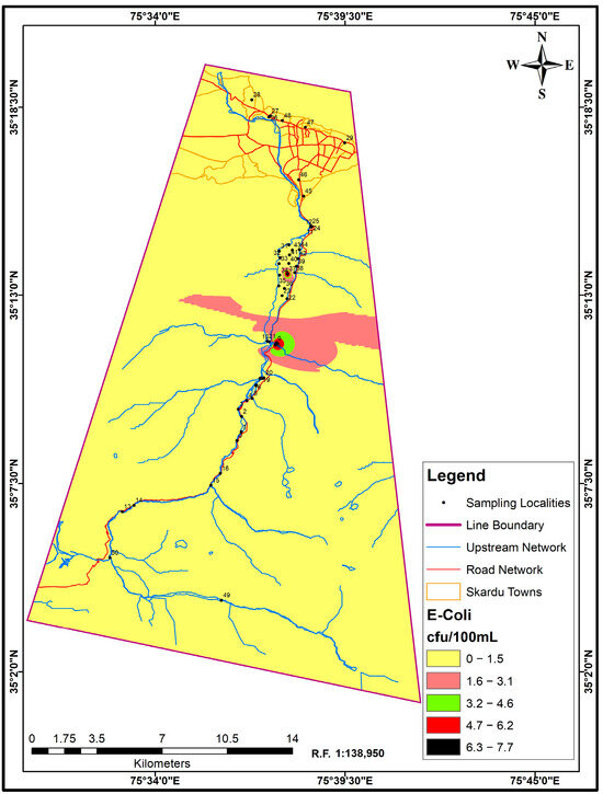 Surface water plays a vital role all over the world and in mountainous areas where it is the primary source for drinking water and irrigation sources as well. Keeping this in view, its suitability for drinking purposes was examined properly according to globally recognized and recommended standards shown in Table 1 mentioned above. The following parameters (E. coli, TDS, EC, pH, Hardness, , , , ,, , and ) were selected for the preparation of the classification map using point data spatial analysis of GIS.