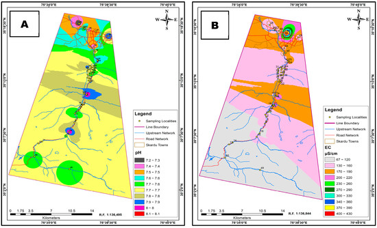The overall concentration level of (EC) in Satpata Watershed is ranging from 67 μScm−1 to 430 μScm−1, with a mean value of 152.1 μS/cm. However, minimum and maximum levels of EC were recorded at Deosai top (67 μScm−1) and spring near Jamia Mosque Skardu (420 μs/cm), illustrated in light gray and red colors in Figure 5B. The overall concentration level of EC is falling within the European Union’s (UN’s) drinking water permissible limits, which show a (2500 μs/cm) concentration level at 20 °C for drinking water.