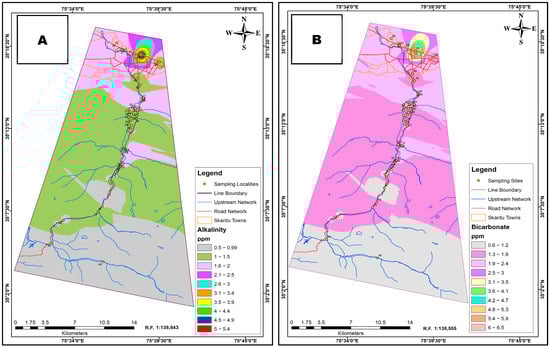 The geospatial distribution of total alkalinity falls between 0.5 and 5.00 ppm. The lowest 0.5–0.89 ppm and highest 2.8–5.4 ppm concentration levels were recorded at Deosai top and Chumik areas showing (acidified) and (endangered) natures, respectively. The overall alkalinity concentration level is falling below the WHO and EU’s prescribed permissible limits. For drinking water quality standards, the US EPA has set 6 categories for alkalinity, where the relationship between alkalinity and pH. If the concentration of CaCO3 is <1 mg/L, then pH will be <5 and acidic, and for <2, 2–5, 5–10, 10–20, and >20 mg/L, alkalinity will be critical, endangered, highly sensitive, sensitive, and not sensitive, respectively. Geospatial variation in the distribution of total alkalinity in Satpara Watershed was recorded at 0.5 to 5.4 ppm, where the lowest concentration was recorded at Deosai Plateau, i.e., 0.5–0.99 (acidified nature), and the highest concentration value was recorded at Chumik, ranging from 5 to 5.4 ppm (overly sensitive), as shown in Figure 6A. However, the saythung to Rangah area’s total alkalinity concentration was falling in the critical condition category [52].