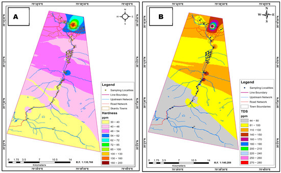 Geospatial variation in the TH concentration was found between 30 and 200 mg/L as Calcium Carbonate (CaCO3). The highest and lowest concentrations were recorded at Deosai Plateau and Chumik areas, i.e., 30 mg/L and 200 mg/L (as CaCO3), respectively shown in Figure 7A and (Table 4). Overall, Satapara Watershed holds a normal concentration of TH according to WHO and EU’s water quality standards. The US Department of Interior and Water Quality Association has categorized the hardness of drinking water in the following way: if hardness ranges from 0 to 17.1, 17.1 to 60, 61 to 120, 121 to 180, and 180 to over, the hardness is classified as soft, slightly hard, moderately hard, hard, and very, respectively [54].