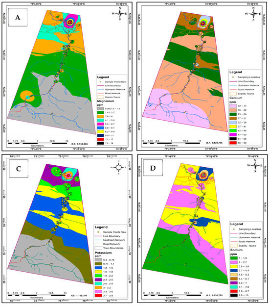 Cations Spatial distributions of Satpara Watershed: (A). (), (B). (), (C). (), and (D). ().