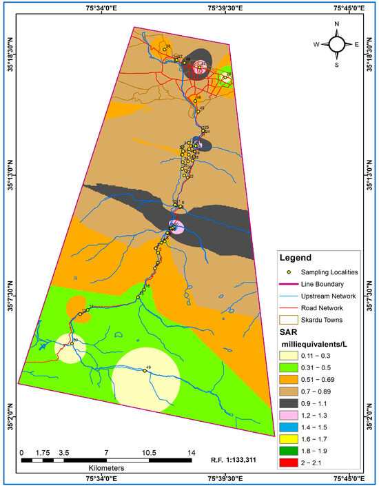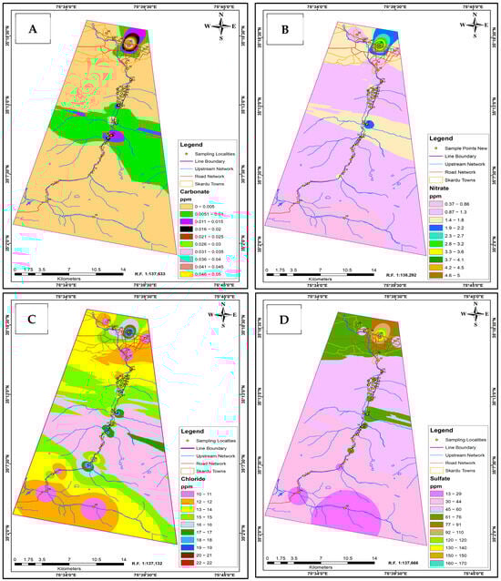 Geospatial variation in the distribution of bicarbonate ranged between 0 and 6.5 ppm, varying from the Deosai Plateau to the Rangah area, wherein Satapara village and adjoining areas are contributing a greater amount of bicarbonate. However, the lowest concentration (0.6–1.2 ppm) was found in the Deosai Plateau, Saythung, and Hussainabad areas. The maximum concentration (6–6.5 ppm) was recorded in the Chumik area shown in Figure 6B. The overall bicarbonate concentration falls within the WHO and ESDWQ water quality standard limits, having no health-related hazards [53].