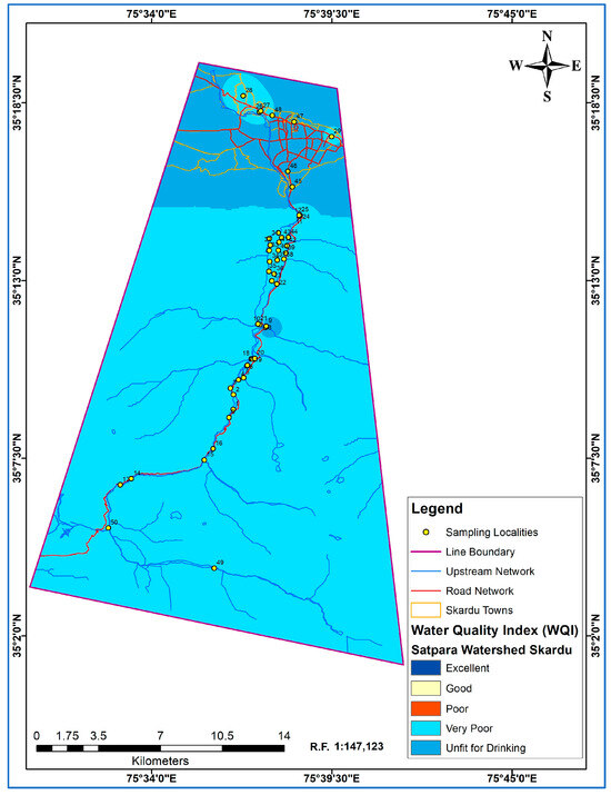 Surface water quality in Skardu, Gilgit-Baltistan, Pakistan, is of immense importance because of the city’s dependence on these resources for domestic uses, agriculture, and drinking water. The water quality index (WQI) was integrated with the Geographic Information System (GIS) to spatially envision and examine water quality data to facilitate the identification of pollution hotspots, trend analysis, and knowledge-based decision-making for effective water resource management. This study aims to evaluate the physiochemical and bacteriological parameters of the Satpara watershed and to provide the spatial distribution of these parameters. This study endeavors to achieve Sustainable Development Goal 6 (SDG 6) by identifying localities with excellent and unfit water for drinking, sanitation, and hygiene. A total of fifty-one surface water samples were collected from various parts of the Satpara watershed during the fall season of 2023. Well-established laboratory techniques were used to investigate water for parameters like Electrical Conductivity (EC), pH, turbidity, total dissolved solids (TDSs), major cations (, , , ), major anions (, , , ), and bacteriological contaminants (E. coli). Spatial distribution maps of all these parameters were created using the Inverse Distance Weighted (IDW) technique in a GIS environment. A significant variation in the quality of water was observed along the study area. The level of Escherichia coli (E. coli) contamination is above the permissible limit at various locations along the watershed, making water unsafe for direct human consumption in these areas. Some regions showed low TDS values, which could adversely affect human health and agricultural yield. From the WQI valuation, 58.82% of the collected samples were “Poor”, 31.8% were “Very poor” and 9.8% were found to be “Unfit for drinking”. The research findings emphasize the pressing need for consistent monitoring and adoption of water management strategies in Skardu City to warrant sustainable soil and water use. The spatial maps generated for various parameters and the water quality index WQI offer critical insights for targeted intercessions.