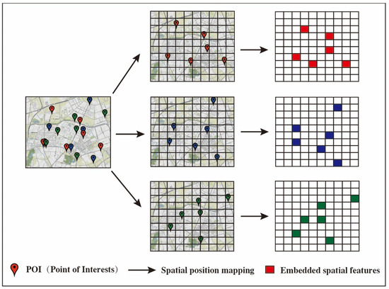 The spatial external feature embedding is embedded into the spatial grid by the spatial features after the position transformation [45], columns such as POI point data P(i, j) on the map (Figure 3), the mapping relationship of the spatial features in the grid position number N is as follows: