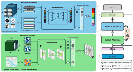 where and are the inputs and outputs of the residual unit, respectively, and is the residual function that can be iteratively accumulated. Figure 4 depicts the overall structure of the spatial–temporal prediction framework, which comprises three components: the temporal basic and external attention module, the spatial basic and external attention module, and the spatial–temporal prediction module. We pool the temporal and spatial bases of features with length, width, and height of w × H × T. We derive the base temporal and spatial attention by pooling the features’ temporal and spatial bases. Weighted fusion involves multiplying self-learned weights by each spatial–temporal component, followed by sigmoid activation for temporal and spatial attention. We feed the residuals from the population density tensor matrix with a time window of j-t into the ResNet backbone network, multiply them with the temporal and spatial fusion attention for weighted fusion, and then fuse them with the inputs to obtain the predicted spatial–temporal features at moment t.