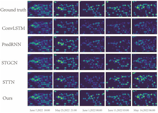 We compare four typical spatiotemporal prediction models. ConvLSTM is a basic spatiotemporal long and short memory prediction model. PredRNN enhances spatiotemporal feature capture by stacking generation using ConvLSTM as a base module. STGCN describes the application of graphical convolution in spatiotemporal prediction. STTN predicts spatiotemporal features through encoder–decoder fusion and transformer fusion. Spatiotemporal features. The first two models reflect the classic framework of spatiotemporal feature prediction, while the latter two represent the popular framework of spatiotemporal feature prediction. We use classic frameworks as baselines to show the improvement of our prediction accuracy. We use currently popular frameworks as baselines to compare them, mainly to show the advantages of our model in terms of efficiency and interpretability.