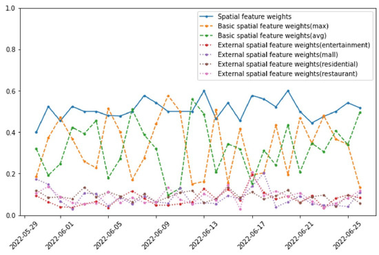 - The attentional weights of basic spatiotemporal features dominated the population distributional characteristics. The attentional weights of external spatiotemporal features were lower than the attentional weights of basic spatiotemporal features most of the time, and the distributions of the weights proved that the spatiotemporal features themselves played a primary role in predicting the distribution of the population and the basic and external spatiotemporal features.