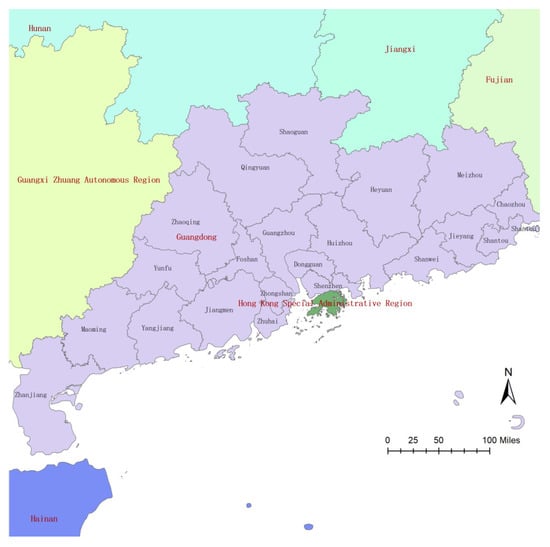 Guangdong is situated at the hub of the maritime transportation routes between the Pacific, Indian, and Atlantic Oceans, with its back leaning on the vast hinterland of China and its front facing Southeast Asia. It is one of China’s important maritime traffic chokepoints, with its communication channels to the outside world and major ports for foreign trade. The length of expressways open to traffic in Guangdong is about 11,500 km, ranking first in China for the 10th consecutive year. The operating mileage of the high-speed railway is about 2838 km, and the operating mileage of the urban rail transit system is about 1373 km. China has built about 400 10,000-ton berths and seven 10,000-ton ports. It has opened more than 400 international container liner routes, covering the world’s major trading ports. Its inland waterways cover 1479 km of high-grade waterways, ranking first in China. Nine airports, including Guangzhou Baiyun and Shenzhen Baoan, have been built, and 36 general aviation airports have been registered, forming the initial system for the general aviation industry. The geographical location of Guangdong province is shown in Figure 1.