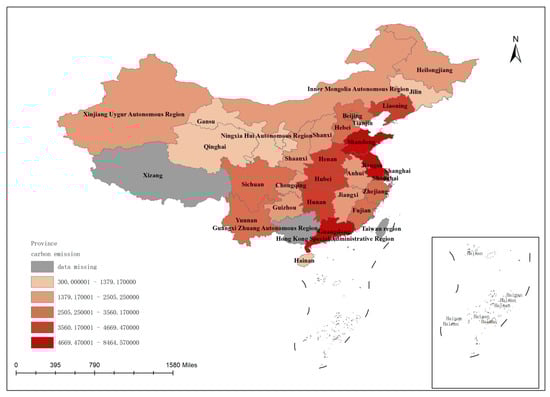 The carbon emission coefficient is calculated according to the average low calorific of various energy sources given in the China Energy Statistical Yearbook and the carbon emission factor in the IPCC [26]. To completely mitigate the epidemic’s effect on traffic carbon emissions, the 2019 data were used to calculate the carbon emissions in 30 provinces and cities.