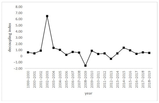 On the basis of Guangdong province’s economic development and carbon emission decoupling elastic index, the result is shown in Table 6, and the changing trend of the decoupling elastic index is shown in Figure 3.