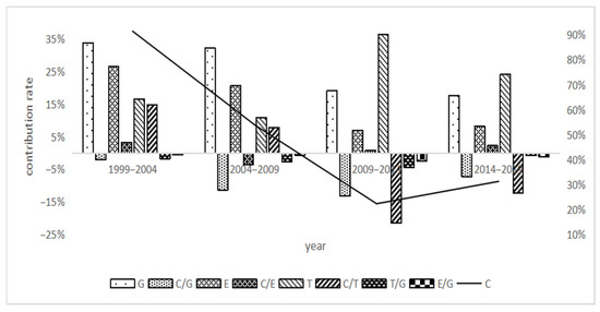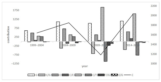 Divided from 1999 to 2019 into four sub-stages—from 1999 to 2004, 2004 to 2009, 2009 to 2014, and 2014 to 2019—the driving factor decomposition results were calculated, as shown in Figure 4 and Figure 5.