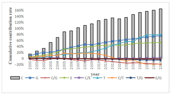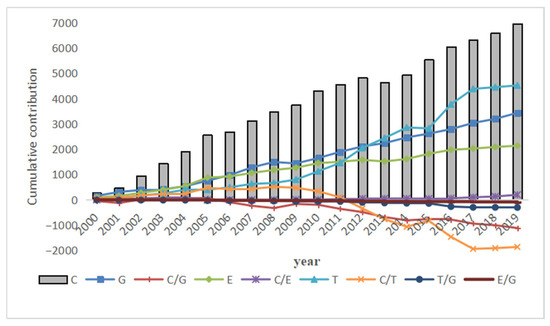 To more accurately depict every variable’s dynamic influence from 1999 to 2019, this paper adds up the contribution rate and contribution value of each factor from 1999 to calculate the cumulative contribution. In Figure 6 and Figure 7, we can see that cumulative traffic carbon emissions rose by 69.56 million tons from 1999 to 2019. The production value of traffic (G) was a significant positive contributor. Because of the increase from 1,526,800 tons in 2000 to 2,372,400 tons in 2019, the cumulative contribution rate to the increase in carbon emissions was 75.83%. One of the key elements contributing to the rise in carbon emissions was turnover volume (T), and its contribution increased and increased dramatically, due to the increase in water transport turnover volume in 2016. From 1999 to 2019, the turnover volume increased by 45.1696 million tons of carbon emissions, and the final contribution rate reached 79.21% and exceeded the production value of traffic. After 2005, the effect of energy consumption (E) gradually became apparent, but its growth was gradual, with a 21.3365 million ton increase in total by 2019. Carbon intensity from energy consumption (C/E) also promoted carbon emissions, but the effect was tiny and less obvious, with only 1,939,500 tons by 2019.
