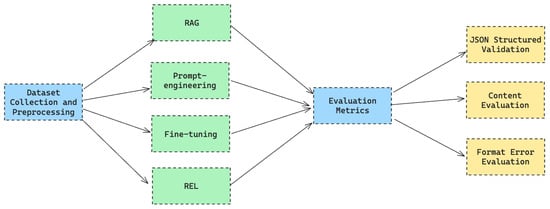 The methodology proposed in this paper revolves around a pipeline designed to generate and evaluate question–answer pairs for general structured output generation and spatial data generation. In this section, we introduce the general methods used for structured output generation, which include fine-tuning, RAG, and prompt engineering. The overall workflow is illustrated in Figure 1. In this end-to-end workflow, we first collect and preprocess the dataset. Using this dataset, we experiment with different methods, applying the same metrics to evaluate the results.