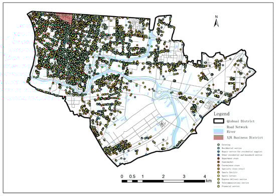 Ultimately, a total of 16,366 commercial facility POIs in the study area were collected. The data were reclassified into six primary categories and thirteen subcategories based on relevant documents [,] (Table 4 and Figure 4). Additionally, POI data for transportation facilities were collected, including bus stops, subway stations, and parking spots, totaling 3446.