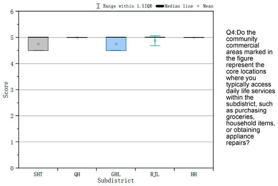 The field survey revealed that identified NCAs not only contain more commercial facilities than other areas within the subdistricts but also experience higher pedestrian traffic. The questionnaire results indicated that in the SHT, QH, GHL, RJL, and HH subdistricts, six, eight, six, seven, and eight respondents, respectively, “strongly agreed” that the NCA serves as the core area for accessing daily life services, such as purchasing food and repairing supplies. The remaining responses indicated “agreement”, with no participants expressing “disagreement” or “strong disagreement” (Figure 11). Notably, 82.5% of the survey participants had lived in the respective subdistricts for more than five years. Overall, the results of both evaluations reflect the reliability of the NCA identification method proposed in this study.