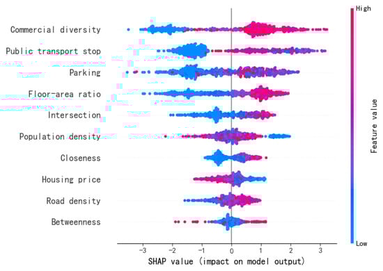 The importance of each variable influencing the formation of the NCA is as follows (Figure 12 and Figure 13): commercial diversity > public transport stop > parking > floor–area ratio > intersection > population density> closeness> housing price > road density> betweenness.