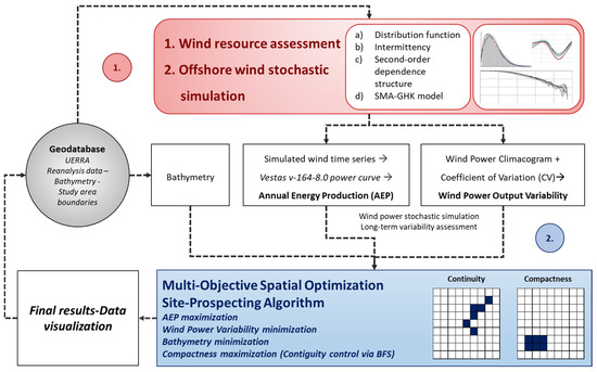 Overview of the methodology discretizing all processing and modeling steps, including (1) offshore wind resource assessment and stochastic simulation and (2) the multiple factors spatial optimization for OWFs site-prospecting.