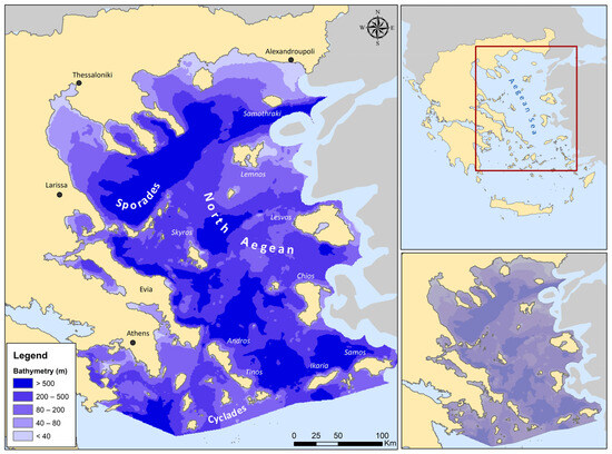 Fixed-bottom structures like gravity-based, monopile, and jacket foundations are restricted to depths less than 70–80 m. However, floating structures can be placed at much greater depths (approx. 80–500 m.), although they have design challenges and technical constraints related to floaters, mooring lines, and anchors, which limit their depth limit [30,31,32]. The Northern Aegean is dominated by shallow shelf areas grading into a deep trench with three sub-basins: Sporades islands, Athos peninsula, and Lemnos Island. Deep basins, with a maximum depth reaching 1.5 km, depending on proximity to the West Anatolian fault, are near shallow areas. By contrast, the central and southern Aegean Sea have smoother bathymetric profiles. For instance, the Cyclades plateau reaches a depth of 400 m. The Central Aegean also includes deep depressions like the Skyros (east) and Chios Basins (west), as well as shallower regions on the west coasts of Lesvos Island, where depths exceed 250 m. The broader Cyclades and the southeastern Aegean Sea generally have shallower waters, but significant depth variations are seen near Ikaria and Samos islands [42]. Bathymetric data for the study were sourced from the Hellenic Navy Hydrographic Service (HNHS, https://hnhs.gr/en/, accessed on 12 November 2024) at a spatial resolution of 500 m.