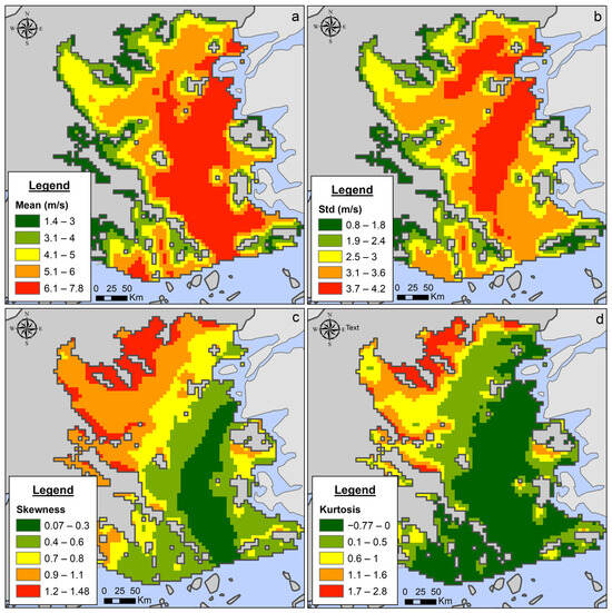 UERRA (MESCAN-SURFEX) reanalysis statistical properties—10 m for: (a) Mean (m/s), (b) Standard Deviation (m/s), (c) Skewness and, (d) Kurtosis.