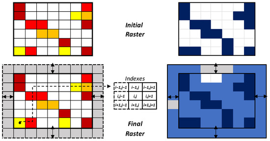 The compactness of a cluster is influenced by the surrounding neighborhood of each cell, with the objective of minimizing the total perimeter area (i.e., free edges) of the cluster. Specifically, the neighborhood of a cell is defined as a two-dimensional square lattice consisting of the central cell and its eight adjacent cells (Moore neighborhood) [62], as demonstrated in Figure 4. Among the total number of cells, NoData values within the raster surfaces are included but are managed by the model, as they do not contribute to the final optimal solutions. NoData cells can be borders, backgrounds, the sea, or other data considered to have invalid values. Consequently, the user can select or define constrained areas, mostly for planning or computational purposes. Figure 4 demonstrates how the algorithm handles the entire raster space, including the boundary cells. Considering an array Ci,j, an expansion of the total number of rows and columns is applied. Consequently, to be able to account for Moore’s neighborhood for the cells (e.g., above the coastline or an exclusion zone), two additional rows and columns are added, forming a final raster dataset Xi,j for i = i + 2 and j = j + 2 (blue array).