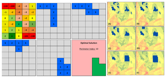 Figure 5 shows both alternative and optimal solutions for a continuous cluster of 5 cells within a hypothetical 5 × 6 raster area (30 cells). The four optimal alternatives, with a minimized total sum of −211, must be further evaluated based on compactness. Hence, the most compact cluster, determined by the smallest perimeter (calculated by free cell edges), has a perimeter of 12 for the first three scenarios (blue areas) and 10 for the fourth scenario. Continuity is guaranteed without applying contiguity constraints since the model minimizes fragmentation and prioritizes small perimeters. However, when compactness has a weight below 0.1, contiguity may not be ensured, leading to fragmented clusters (see Figure 5E). Additionally, increasing the compactness weight raises computational effort due to the non-linearity of the spatial optimization objective.