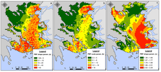 (a) PBF shape parameter c, (b) PBF shape parameter a and (c) PBF scale parameter b.