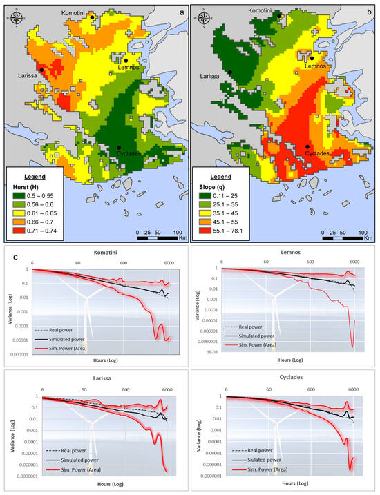 (a) Hurst coefficient (H), (b) Slope (q) for the study area, and (c) climacograms for different areas (pixels) between UERRA and SMA-GHK long-term simulated power output variance using Equation (1) (modified by Reference [42]).