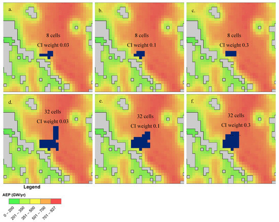 where C is the set of all raster with total I rows and J columns, is the compactness weight, and are the weights for the AEP and WPV respectively and is the weight for the DP raster. For each , represents the value of AEP, the value of WPV, the DP and represent the total cell edges that contribute to the cluster perimeter; is a binary variable (0 or 1) to represent whether the belongs to the final solution or not.
