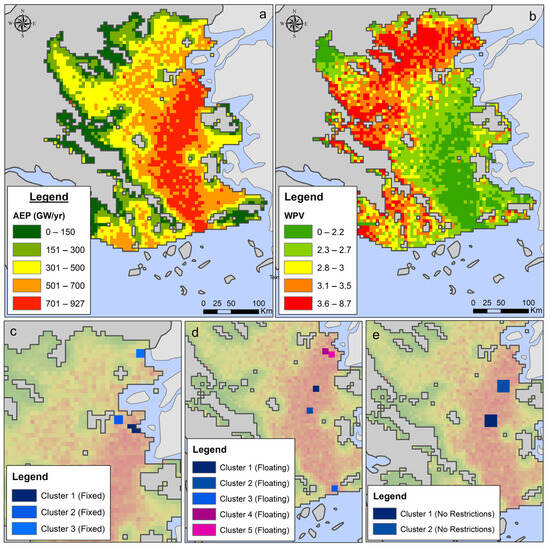Considering the weighted criteria, the weighted sum method was employed as a fundamental and user-friendly approach for multi-objective optimization. As emphasized in the literature [85], when assigning weights for the a priori specification of preferences, it is crucial that each weight’s value is significant relative to other weights and their associated objective function. Consequently, only the relative importance of the objectives should be prioritized rather than the relative magnitudes of the function values. In this work, compactness and bathymetry are the most critical criteria for shape control and determining the technology used (i.e., fixed-bottom or floating foundations) in the optimal clusters. Accordingly, several additional runs were conducted with various weighting factors to identify the appropriate ranges for compactness (CP) and bathymetry (BP) weights, as well as the weights for the remaining criteria, AEP and WPV, and their inherent impact on the model configurations (see Table A1 in the Appendix A).