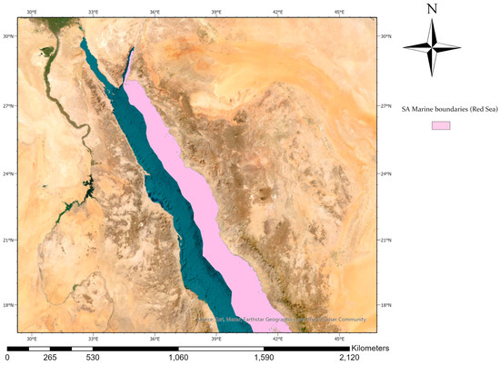 The Red Sea, sometimes referred to as Bahr al Ahmar in Arabic, has an elongated shape and is around 2000 km in length, reaching a maximum width of 355 km and covering a surface area of approximately 458,620 km2. The Red Sea can be divided into three separate depth zones, comprising shallow shelves with depths of less than 50 m, deep shelves ranging from 500 to 1000 m, and a central axis with depths ranging from 1000 to 2900 m. An estimated 25% of the Red Sea’s area is characterized by depths of less than 50 m, while around 40% is shallow, reaching depths of less than 100 m [26]. Figure 1 depicts the study area of this paper: the Red Sea in Saudi Arabia.