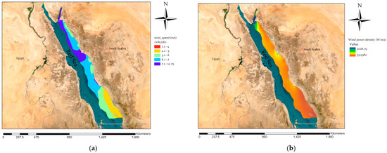 As shown in Figure 6a, the wind speed of the Red Sea exhibited notable variations across several geographical areas. In the southern regions, the average wind speeds primarily fell within the range of 4 to 6 m/s. As we moved into the middle region, a significant change took place, and the average wind speeds ranged from 6 to 7 m/s. As we moved towards the north, the wind speeds increased, with most of them being between 7 and 12.75 m/s. These particular regions are notable for their high winds, which provide significant opportunities for energy generation and for the implementation of wind energy projects with enhanced efficiency. In general, the wind speeds in the Red Sea vary along the north–south gradient. The central and northern areas are particularly suitable for wind energy development because they have higher wind speeds. Wind speeds of 4 m/s and less are considered unsuitable for offshore wind projects.