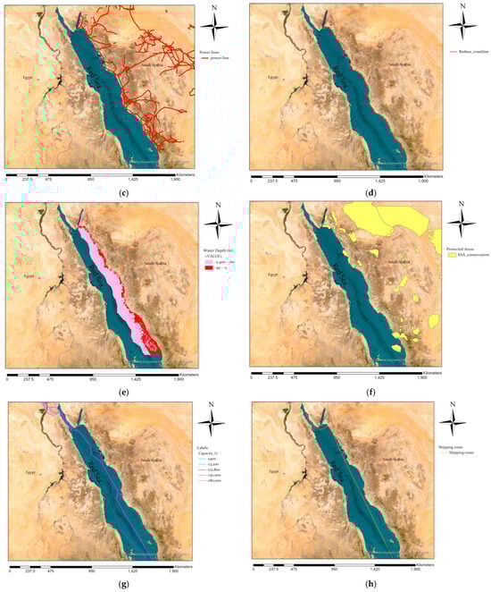 Criteria data. (a) Average wind speed at 100 m AGL; (b) wind power density; (c) electricity power lines; (d) the Red Sea coastline; (e) water depth; (f) protected areas; (g) underwater cables; (h) main shipping route.