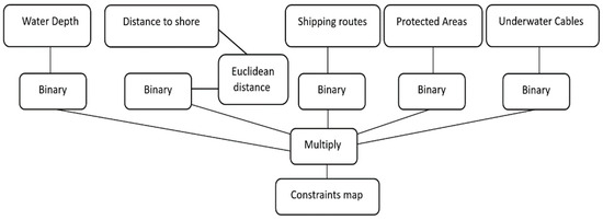 For the shipping route, protected areas, and underwater cables, a feature-to-raster tool was used to transform the data into raster format. Then, all datasets, including constraints, were converted into binary format, presenting raster values of 0 and 1. A value of 0 represents unsuitable areas, while a value of 1 represents suitable areas. To obtain the constraints map shown in Figure 4c,d, all the binary layers were multiplied using the Boolean OR process. There were two constraint maps that differed based on the turbine types.