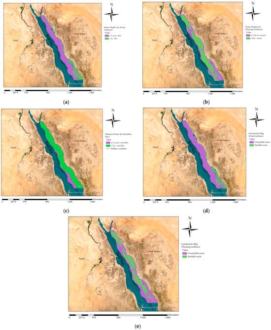 For the Red Sea coastline layer, the Euclidean distance was determined to compute the distance from the shore, and then the layer was reclassified and converted to 1 and 0 according to distance. As shown in Figure 4c, the suitable regions between 1.5 km and 100 km from the shore are depicted in green. Locations that are far away from the shoreline were considered inappropriate due to the increased cable costs [14].