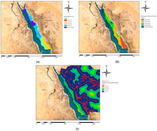 In the northern region of the Red Sea, a particular location displayed values ranging from 401 to 500 W/m2, which was indicative of heightened energy potential. Furthermore, two specific regions possessed outstanding energy resources, demonstrating exceptionally high wind power density ranging from 501 to 2028 W/m2. The distances from power lines according to the new classification values are shown in Figure 6c. The optimal location for offshore wind farms is in close proximity to pre-existing power infrastructure, which facilitates a reduction in cabling costs and a decrease in the complexity of installation and maintenance processes [18].