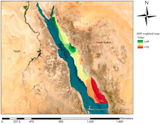 In 2018, Mahdy and Bahaj assessed the offshore wind resources in the Red Sea region and the Mediterranean Sea around Egypt. Spatial assessment was performed via GIS-based multi-criteria decision analysis (MCDA), and AHP was used to give weight to each criterion. The evaluation criteria considered were wind power density, water depth, distance from the shoreline, soil properties, and distance from the National Grid. Shipping routes, ports, military zones, natural parks, cables and pipelines, fishing areas, and oil and gas extraction areas were deemed problematic and considered grounds for exclusion. Different evaluation and constraints criteria were aggregated using GIS tools and the WLC (Weighted Linear Combination) aggregation method. The WLC integrates various elements by multiplying each factor’s value by its corresponding significance (weight) and aggregating these weighted values to yield a final suitability score. Three suitable sites were identified: two in the Egyptian territorial waters and a third between Egypt and Saudi Arabia [14].