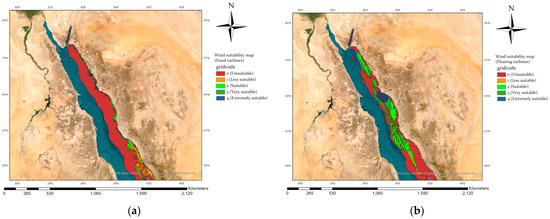where SIl represents the suitability index of location l; Bl represents the binary score of location l in the constraints map; and Sl represents the suitability index of location l. Furthermore, Figure 8b shows two main regions categorized as class 4, both of which have a high level of suitability for the installation of floating turbines. The underwater cables and main shipping route divide these areas, which exist in the north and middle of the Red Sea, into multiple areas. The total areas of candidate sites suitable for floating turbines exceed those that are suitable for fixed turbines, as shown in Figure 8a.