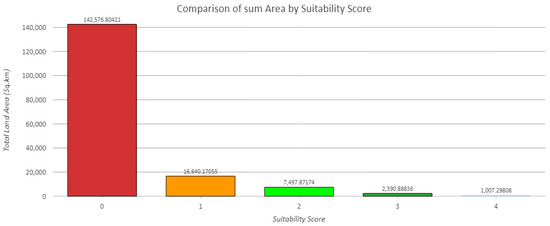 This paper aimed to find suitable locations for offshore wind energy generation in Saudi Arabia, with particular focus on the Red Sea. Several spatial processing approaches were applied to reclassify the three evaluation criteria (wind speed, wind power density, and power lines) to a range of 0 to 4, where 0 indicates unsuitability, 1 indicates the lowest level of suitability, and 4 represents the highest level of suitability. Subsequently, all reclassified criteria were combined with their respective weights. The weights were determined using the MCDM approach and the AHP technique. The experiments were conducted utilizing the ArcGIS Pro 2.5.0 software. The criteria for constraints, namely water depth, distance from the shore, main shipping routes, protected areas, and underwater cables, were converted into binary representations, in which a value of 0 indicated that the site was unfit for wind energy generation purposes, while a value of 1 represented a suitable location. To identify the most suitable wind farm locations from the research area map, the weighted and constraints criterion maps were merged by combining their suitability index with their binary scores. Figure 8a,b show the resulting maps, while Figure 9 and Figure 10 illustrate the total geographical area covered by the different suitability classes. The overall area available for constructing floating turbines is considerably larger than the total area that is suitable for installing fixed turbines, largely due to the fact that fixed turbines can only be installed at depths between 5 and 60 m. On the other hand, floating turbines have a wider range of permissible water depths, ranging from 60 to 1000 m.