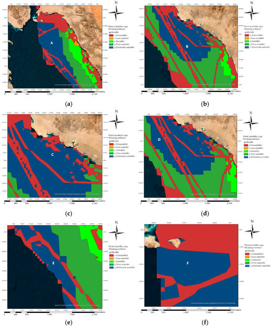Suggested areas for offshore floating turbines in the Red Sea, (a) Location A, (b) Location B, (c) Location C, (d) Location D, (e) Location E, (f) Location F.