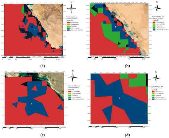 Suggested areas for the offshore wind farm of fixed turbines in the Red Sea, (a) Location A, (b) Location B, (c) Location C, (d) Location D.
