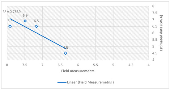 The low RMSE value of 1.24 indicates that there was little variation between GWA predictions and field measurements, with the largest deviation of 1.8 (observed in the Jazan region) still falling within acceptable limits. The correlation analysis yielded an R2 value of 0.75, as shown in Figure 13, demonstrating a strong positive relationship between GWA estimates and field measurements. While field measurements consistently showed slightly higher values than GWA predictions, this systematic difference was uniform across all locations. The consistency and predictability of this variation, combined with the strong correlation coefficient, support the reliability of GWA data for spatial suitability analysis in this region.