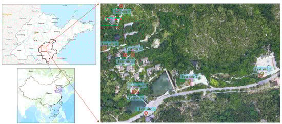 This study selected the Yimeng Mountain Ginza Tianmeng Mountain Scenic Area in Fei County, Linyi City, Shandong Province as the experimental site. The area encompasses approximately 240 km2, with a planned core zone of around 96 km2, as illustrated in Figure 1. The highlighted area in the figure serves as the verification point for our algorithm tests. The terrain is characterized by its complexity, featuring mountains, forests, waterfalls, and elements of red culture, making it a typical mountain tourism destination renowned for its steep topography and high forest coverage. Mountain scenic spots encompass vast areas with complex surrounding environments, making it difficult to obtain spatiotemporal information about tourists. The management of these scenic spots presents additional challenges, although near-field sensor networks can cover nearly all areas. This method is particularly effective for detecting and recognizing non-cooperative target tourists when capturing facial features proves difficult. It facilitates rapid route searching and aids in the safety management of scenic areas.