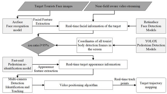 The technical framework and overall process of passive perception and path tracking for tourists in mountain scenic spots, based on F2B technology, are illustrated in Figure 2. Initially, the faces and bodies of tourists are extracted from the real-time video stream using the RetinaFace and the YOLOX model, respectively. The ArcFace model is then employed to extract facial features of the target tourists, which are subsequently matched with the faces detected by RetinaFace. Following this, the Hungarian algorithm is utilized to compute and retain results with an Intersection over Union (IoU) of more than 95% for the construction of a multi-feature database. Finally, the Fast-ReID model and spatial position algorithm are applied for the multi-feature coupled re-identification of tourist targets, enabling the drawing of trajectories that contain spatiotemporal information. The core technologies involved include (1) real-time feature acquisition of the target tourist; (2) re-identification through multi-feature cascade coupling; and (3) target tourist positioning and tracking of target tourists.