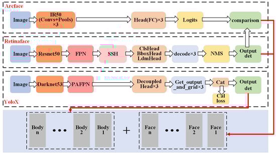 To address the challenge of extracting appearance features from non-cooperative targets and to enhance recognition efficiency, we propose a pedestrian re-identification architecture that employs a cascade coupling of body and facial features. The preparatory work involves utilizing the Hungarian algorithm to process the collected feature set of the target individuals, ensuring that only results with an Intersection over Union (IOU) of 95% or greater are retained. This approach yields a real-time cascade feature set that accurately matches the target’s face and body. When searching for specific individuals, the pedestrian recognition model based on Fast-ReID is employed. The overall architecture is illustrated in Figure 4.