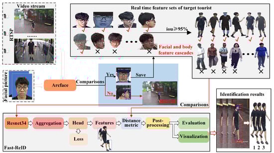 Initially, the video stream is processed frame by frame. Arcface is utilized to extract facial images from the target tourists and to compare them with the video frames. Successful matches are incorporated into a special collection to enhance the facial features. Conversely, video frames that do not achieve successful identification are resized to 256 × 128 pixels before being processed by Resnet34 for feature extraction. And then, the aggregation module combines the features generated by the backbone network into a global feature representation, which is then forwarded to the Head module for normalization and dimensionality reduction. The processed features enter the distance metric stage, where they are compared with the target features in the feature set. At this stage, body features replace facial features to identify, thereby accomplishing the coupling from face to body. Local feature matching is performed using the Deep Spatial Reconstruction (DSR) method, which generates more detailed local features. The results are refined through two reordering techniques, K-reciprocal and Query Expansion (QE), to further enhance accuracy. Finally, the results are evaluated and visualized, completing the re-identification process of the target tourists across multiple cameras. The frames captured before and after identification are also stored to augment the database of target appearance features.